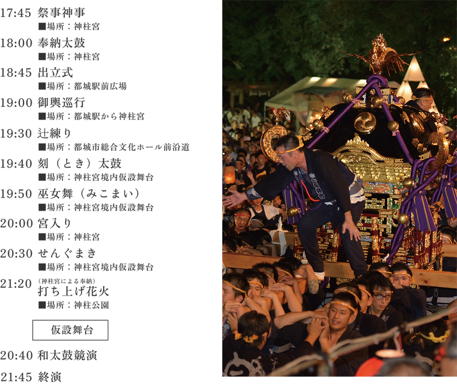 本祭りでは、夕刻よりJR都城駅前広場に祭り衆が集まり、出立式が執り行われ出立宣言ののち、駅前の市街地沿道を笛や太鼓の囃子方を先頭に数基の御輿が神柱宮を目指し、約1.5kmの道のりを勇壮に練り歩く宮入り巡行が行われます。